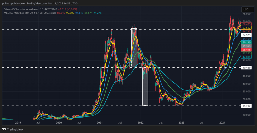 Bitcoin (BTCUSDT): dierio, los picos se formaron cerca de los $65000, con el cuello en $40000