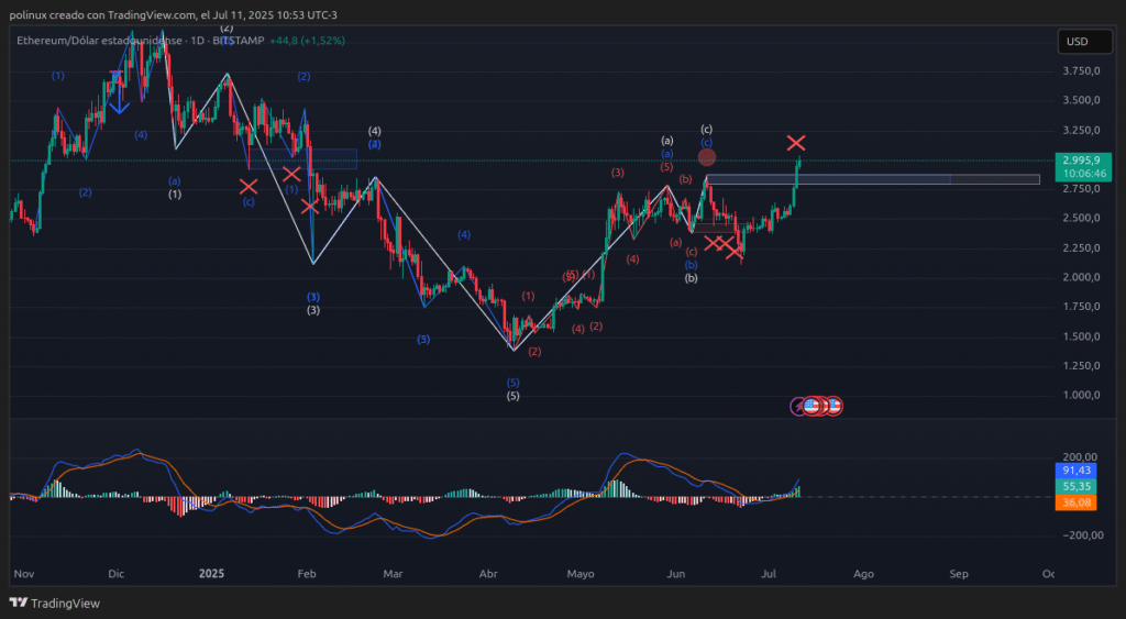 Ethereum acaba de confirmar una manipulación técnica que derivó en una acumulación de manual, como pocas veces se ve en el mercado cripto. Esa estructura de rango con manipuleo incluido fue absorbida con una fuerza que no deja dudas: al romper los 2.800 dólares, Ethereum soltó el lastre bajista y comenzó una fase expansiva que está apenas en sus primeras etapas. Los niveles de 3.200, 3.500 y hasta 3.600 dólares no son utopía; son objetivos técnicos posibles en base a simetrías anteriores.