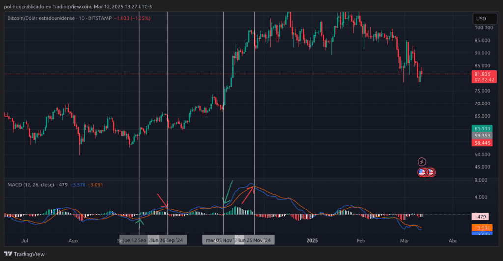 - Falsas Señales en Lateralidad: El MACD funciona mejor en mercados tendenciales. En períodos laterales, puede generar múltiples señales erróneas, provocando entradas y salidas fallidas. (como podes ver en el grafico anterior, la lateralizacion que hizo y siempre nos marco a la baja)