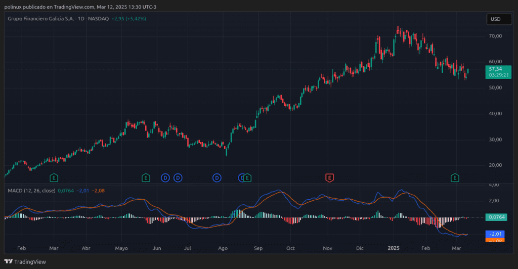 - En acciones como Galicia, el MACD mostró señales mixtas. Algunas entradas fueron efectivas, pero en múltiples ocasiones arrojó señales erróneas, especialmente en períodos de consolidación.