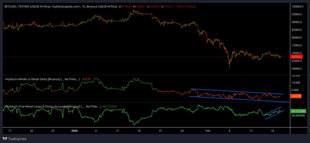 Y hoy el flujo dice algo incómodo: las grandes carteras están vendiendo mientras el minorista empieza a comprar el rebote. Esa combinación, en la historia del mercado cripto, rara vez termina con el retail celebrando.