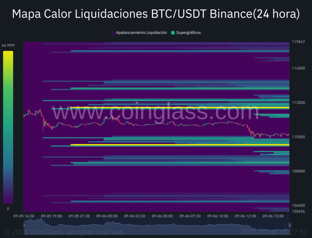En gráficos de 1 día, Bitcoin pelea un nivel clave en 110k–112k. Mientras no logre cierres sostenidos sobre 120k, la estructura técnica sigue sin confirmar tendencia alcista. El rsi esta en neutral, lo que indica una buena ventana para acumulacion. MACD esta con señal bajista pero con un inminiente cruce alcista. En el corto plazo podemos ver por el mapa de liquide que hay fuertes zonas en 112k -109k, desde mi punto de vista nuestro soporte claro esta en el 109k (la ema de 100 esta ahi), si rebotamos ahi, como venimos haciendo no hay de que preocuparse. Ahora, si perforamos eso, creo que tranquilamente vamos a ir a buscar los 104-105k (ema de 200).
