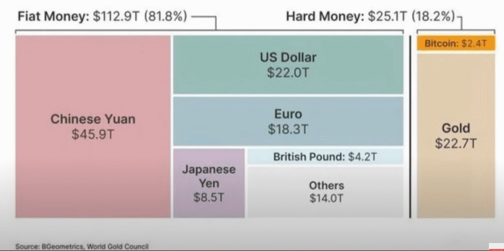 En este punto quiero detenerme en un gráfico que me impactó. A la izquierda muestra la oferta monetaria global: EE.UU. con 22 billones frente a China con 46 billones. A la derecha, la capitalización del oro físico y de Bitcoin, que ronda apenas los 2,5 billones. Es decir, apenas un 1,7% de toda la masa monetaria fiat. Para mí, eso es un recordatorio de que Bitcoin todavía es chico frente al sistema financiero, y que como mínimo debería representar ese mismo porcentaje en un portafolio diversificado.