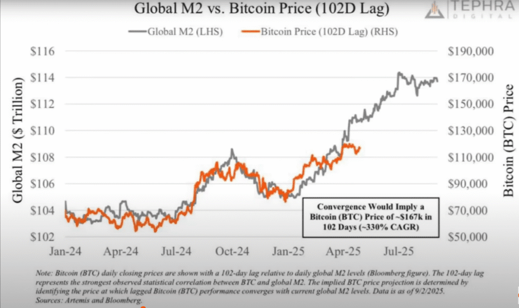 También noto que el precio de BTC suele seguir el crecimiento de la oferta monetaria con un rezago de 90 a 100 días. Si aplico esa lógica, hoy mismo debería estar cotizando cerca de 165.000 dólares. Y si al crecimiento monetario le sumo lo que se viene en stablecoins —un mercado que puede pasar de 0,3 a 3,7 billones— parte de esos flujos terminarán en Bitcoin. Eso llevaría la cotización hacia la zona de 200.000–250.000 dólares en el mediano plazo.